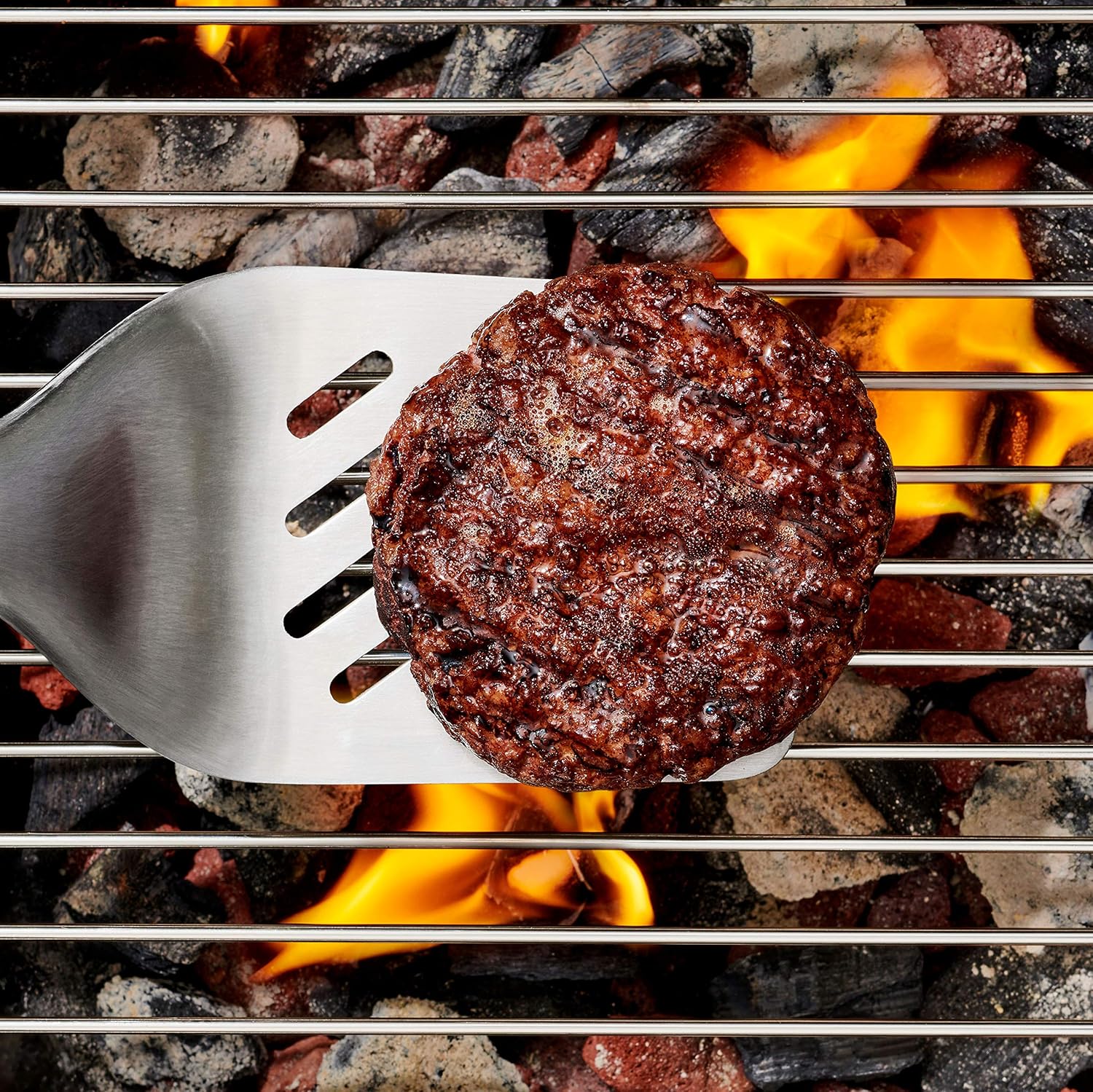 - Durable stainless steel turner is perfect for flipping burgers on the grill