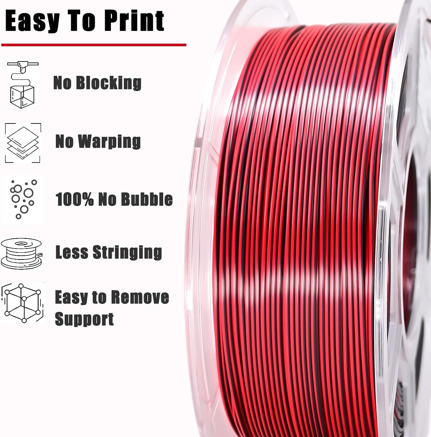 - DUAL-COLOR SILK PLA FILAMENT - Each line of this PLA filament is made up of two colors Black and Red, so even if you print a mini-object you also get two colors.
