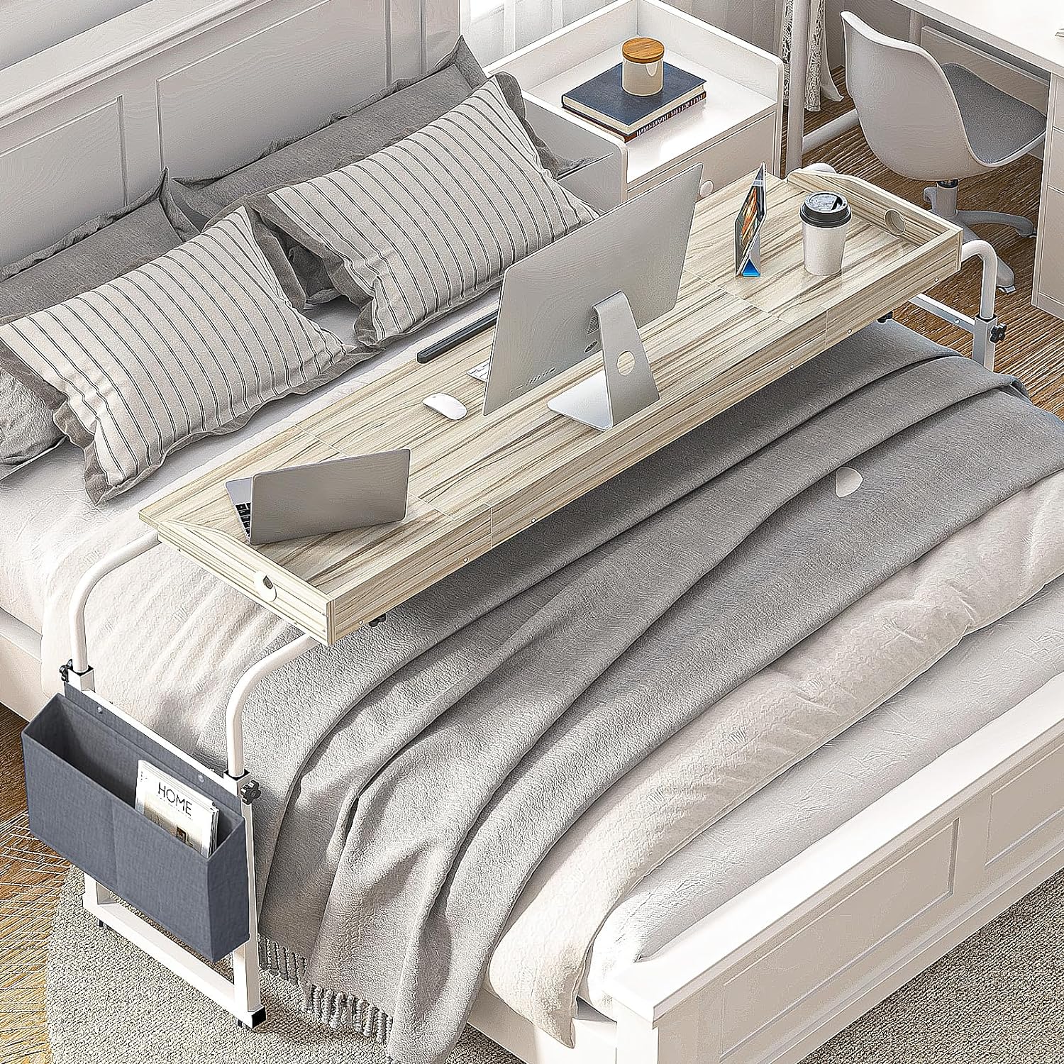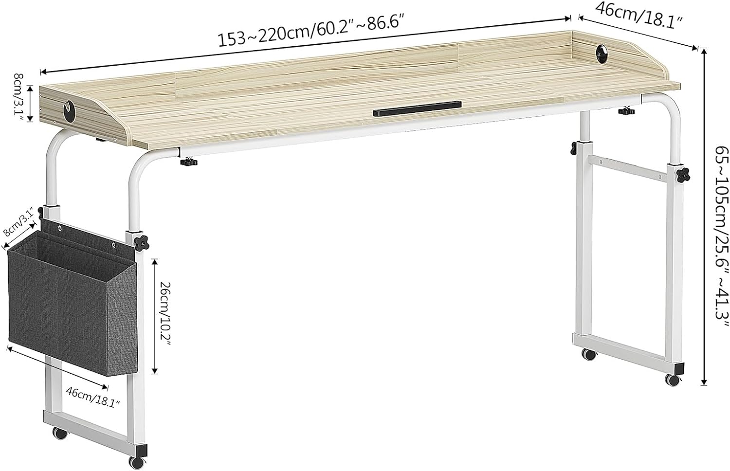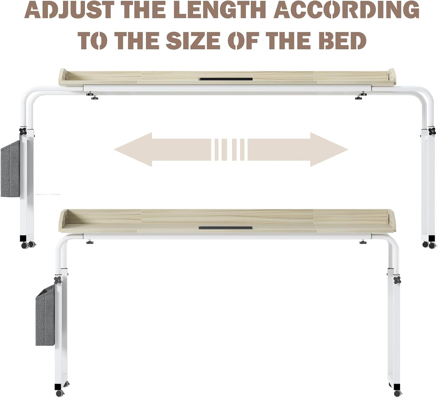 - ✅Overbed Table Designed for Comfort: Measuring 60.2" L x 86.8" W x 18.1" H; Height adjustable from 25.6 to 41.3 inches. With 18 levels of height adjustment, you can easily find the perfect ergonomic position for your activities, whether it's reading, working on a laptop, or having meals. Additionally, the tiltable tabletop can be adjusted to various angles, ensuring you can find the optimal setup for your needs. The whole desk width can be used over any sized mattress, from Twin to King size.