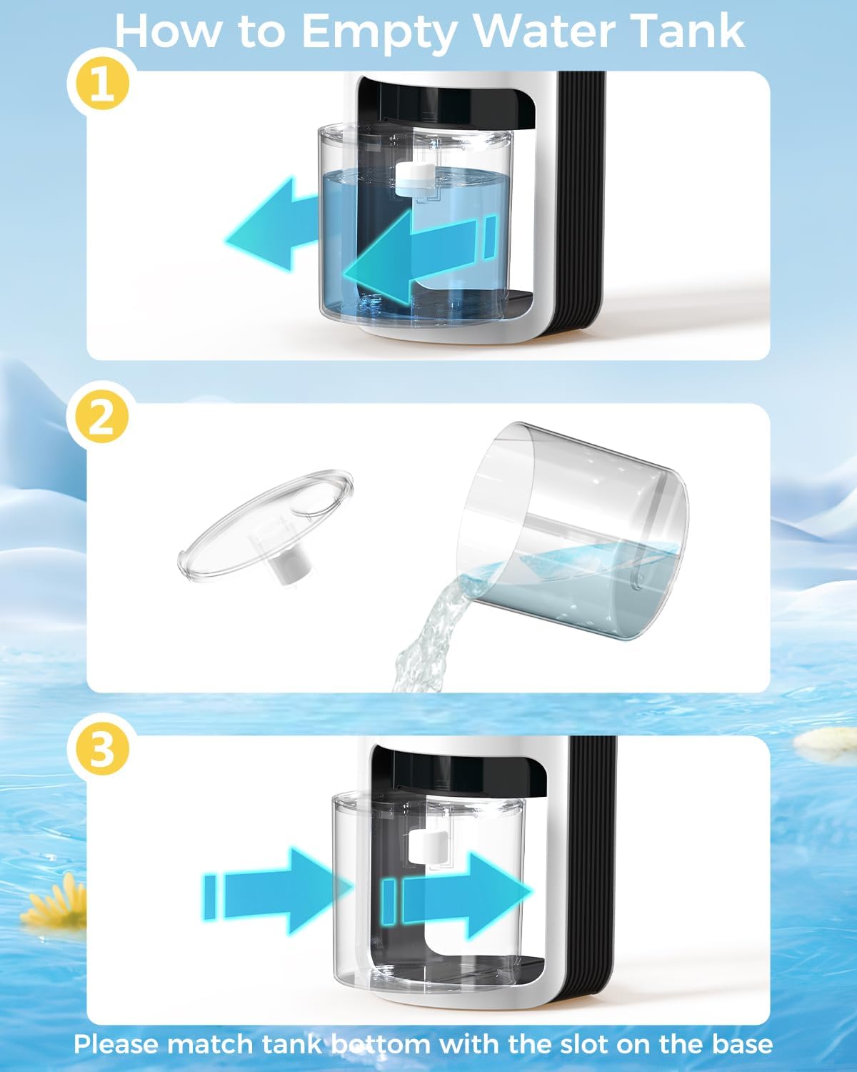 - Portable & Compact Dehumidifier: Easy to place anywhere. Lightweight and portable, this dehumidifiers for home can be positioned in various spaces such as the bedroom, bathroom, closet, kitchen, cabinet, garage, RV, and more. Say goodbye to damp troubles with this efficient solution! (Power: 40 watts. Water Tank: 42oz/1200ml. Size: 5.6"D x 6.37"W x 11"H)